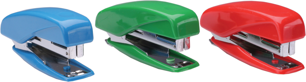 Plastová mini zošívačka. Spinky č.10. Kapacita 15 listov. Vklad 50 mm.