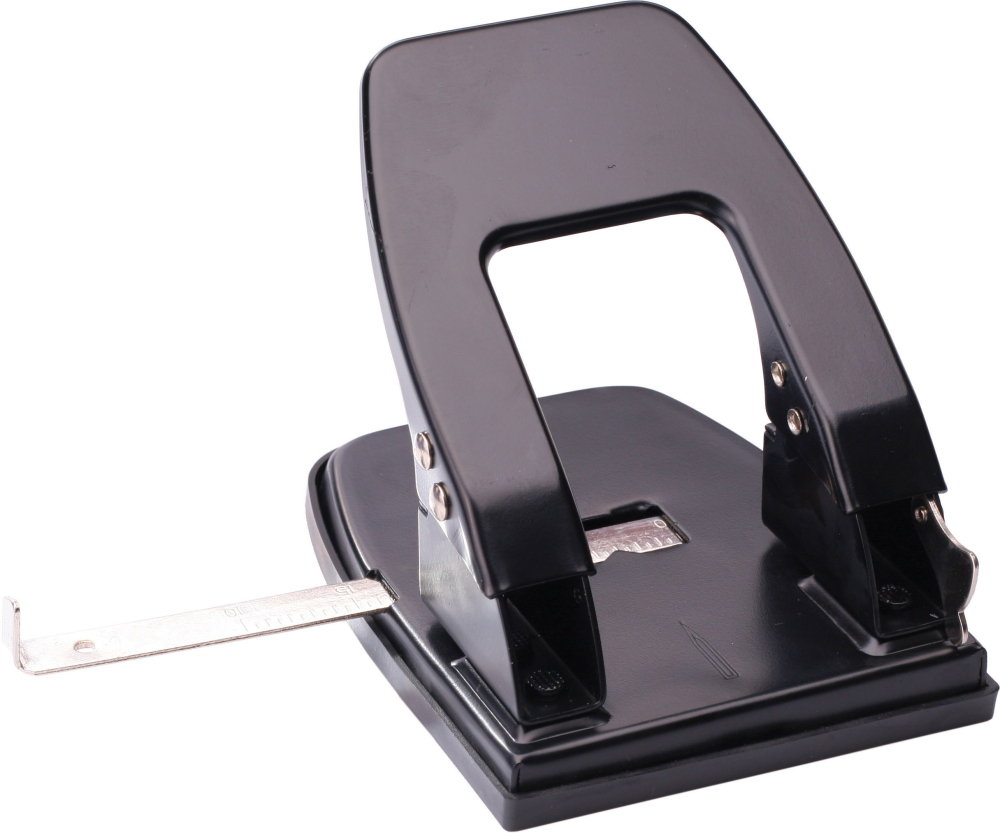 Veľký kancelársky dierovač kovový na 25 listov s dorazom. Farba: čierna.