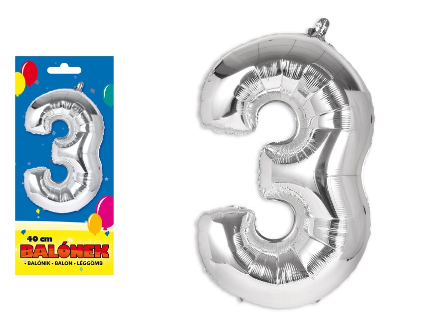 Nafukovací fóliový balónik v tvare čísla 3. Balónik je vyrobený zo striebornej fólie. Na hornom okraji balónu sú očká na priviazanie. Balóniky sú vhodné na narodeninové oslavy, firemné párty a iné spoločenské udalosti.Výška balónu: 40 cmUvedená
