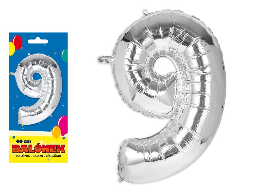 Nafukovací fóliový balónik v tvare čísla 9. Balónik je vyrobený zo striebornej fólie. Na hornom okraji balónu sú očká na priviazanie. Balóniky sú vhodné na narodeninové oslavy, firemné párty a iné spoločenské udalosti.Výška balónu: 40 cmUvedená