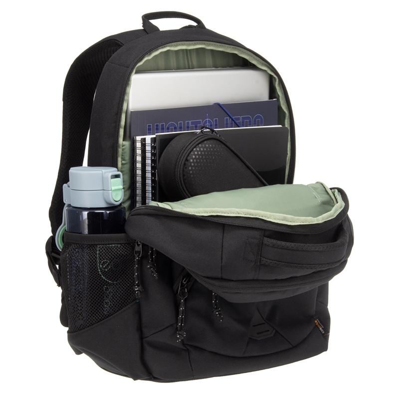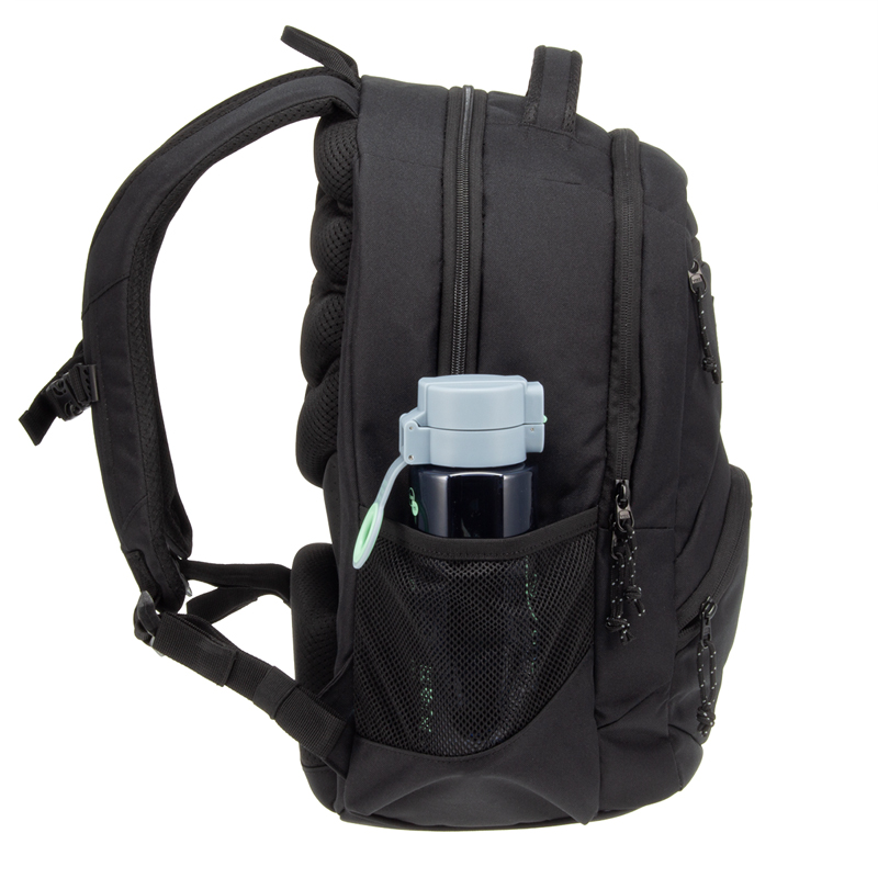 Jasne transparentné, praktické na usporiadanie, ktorých súčasťou sú 2 bočné sieťované vrecká na fľašu s vodou a malé školské potreby, 1 veľká priehradka s polstrovaným držiakom na notebook.