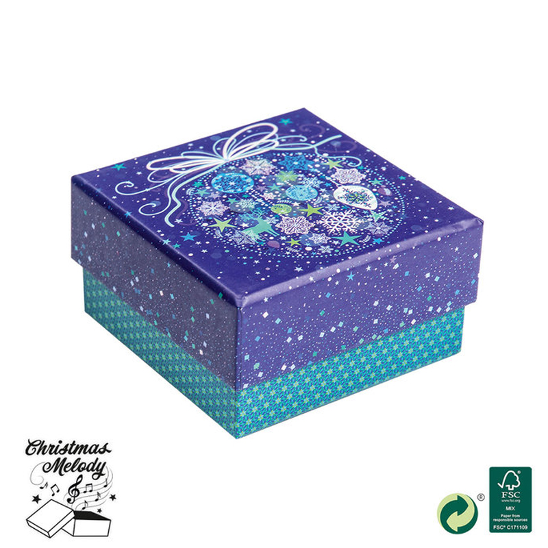 Vianočná darčeková krabička s hudbou. Po otvorení krabičky sa spustí skladba s vianočnou tematikou „Jingle Bells''. Vianočné krabičky sú nádhernou možnosťou ako zabaliť drobnosti pre Vami milované osoby pod vianočný stromček. Krabička obsahuje batériu. Rozmery: 9,5 x 9,5 x 5 cm.