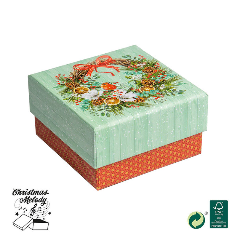Vianočná darčeková krabička s hudbou. Po otvorení krabičky sa spustí skladba s vianočnou tematikou „Jingle Bells''. Vianočné krabičky sú nádhernou možnosťou ako zabaliť drobnosti pre Vami milované osoby pod vianočný stromček. Krabička obsahuje batériu. Rozmery: 9,5 x 9,5 x 5 cm.