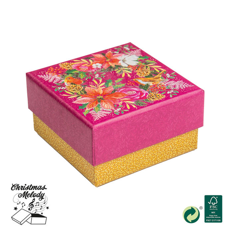 Vianočná darčeková krabička s hudbou. Po otvorení krabičky sa spustí skladba s vianočnou tematikou „Tichá noc''. Vianočné krabičky sú nádhernou možnosťou ako zabaliť drobnosti pre Vami milované osoby pod vianočný stromček. Krabička obsahuje batériu. Rozmery: 9,5 x 9,5 x 5 cm.