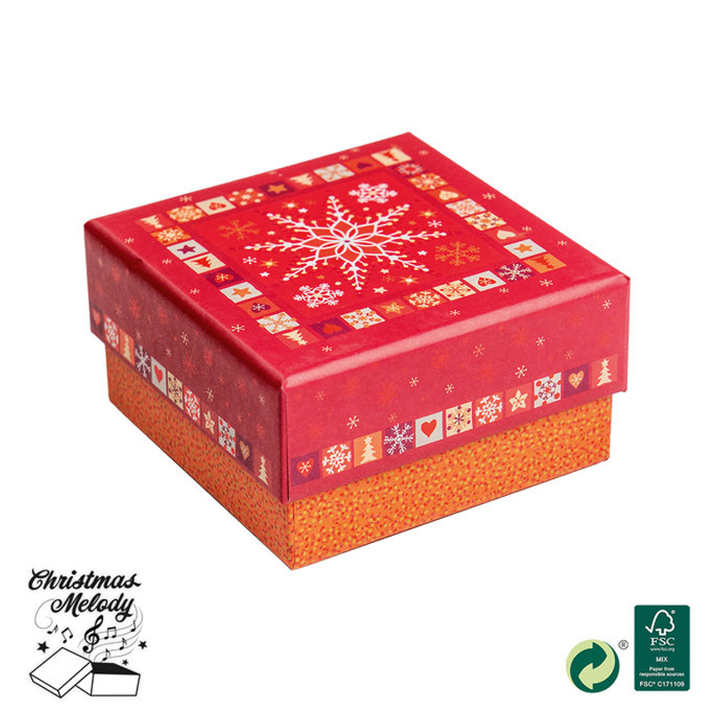 Vianočná darčeková krabička s hudbou. Po otvorení krabičky sa spustí skladba s vianočnou tematikou „We wish you a merry Christmas''. Vianočné krabičky sú nádhernou možnosťou ako zabaliť drobnosti pre Vami milované osoby pod vianočný stromček. Krabička obsahuje batériu. Rozmery: 9,5 x 9,5 x 5 cm.