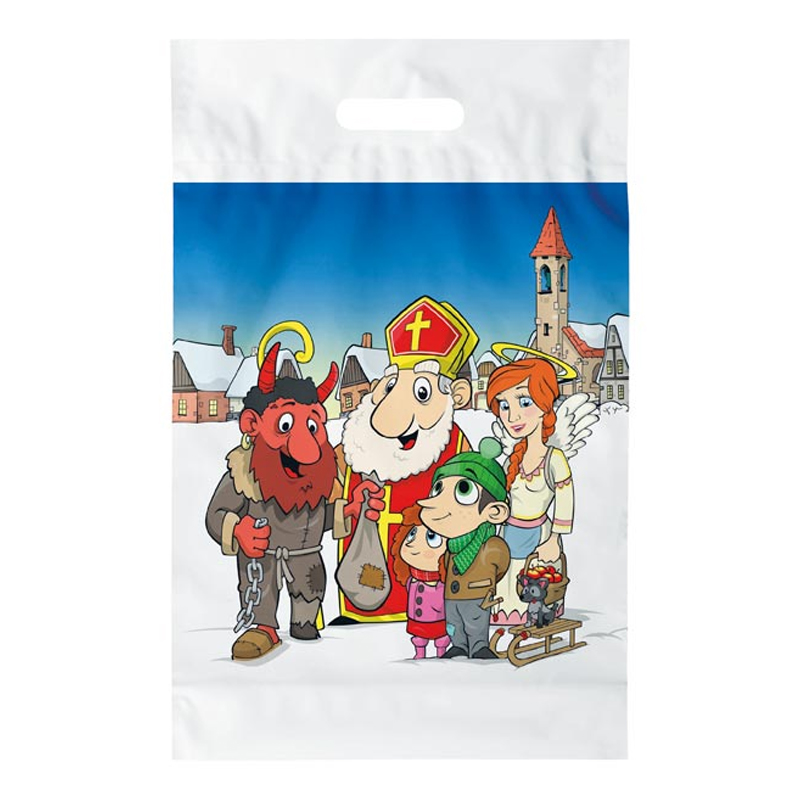 Igelitová taška s priehmatom s mikulášskym motívom. Na taške je obrázok Mikuláša, anjela, čerta a vianočných darčekov. Rozmery: 30x46x8 Materiál: PE