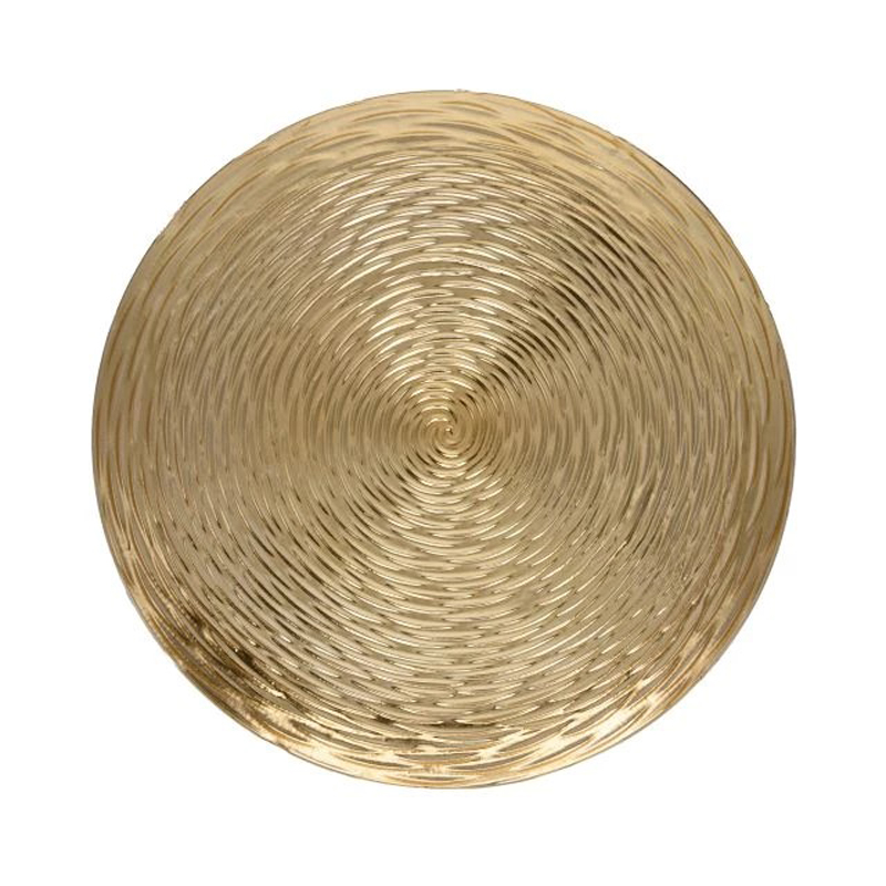Dekoračný tanier okrúhly umelý. Môžete ho použiť ako podtanier alebo samostatnú dekoráciu na Váš stôl. Zakomponujte doň dekoratívne figúrky alebo sviečky a miestnosť získa nový charakter. Farba: zlatá. Materiál: plast. Rozmer: 33x33x2 cm.