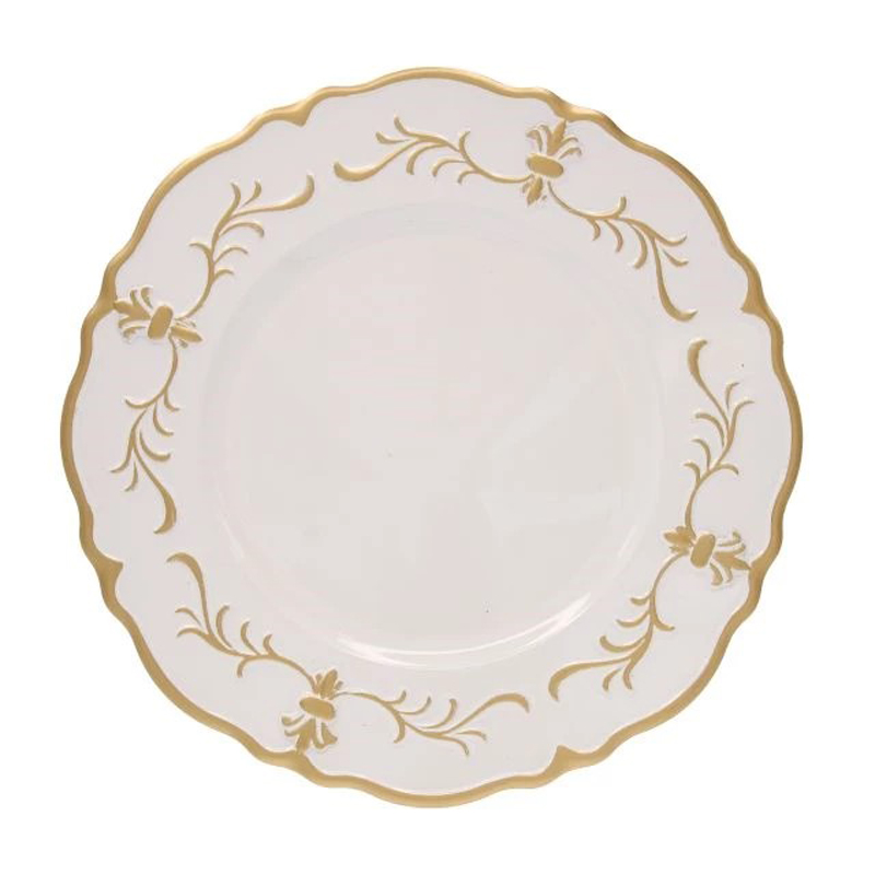 Dekoračný tanier okrúhly umelý. Môžete ho použiť ako podtanier alebo samostatnú dekoráciu na Váš stôl. Zakomponujte doň dekoratívne figúrky alebo sviečky a miestnosť získa nový charakter. Farba: bielo-zlatá. Materiál: plast. Rozmer: 33x33x2 cm.