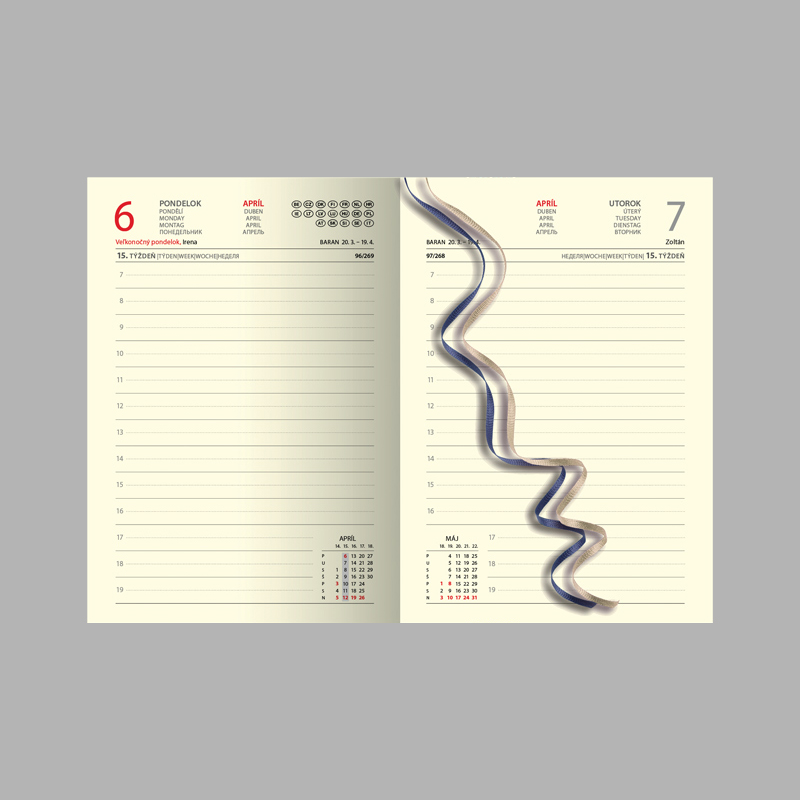 Obľúbený denný diár s motívom folklórnej stuhy. Má oderuvzdorný povrch. Efektná razba fóliou a 3D lak vytvárajú krásny dizajn. Jazyková mutácia: SK, CZ, UK, DE, RU. Rozmery: 142x204 mm. Počet strán: 368.