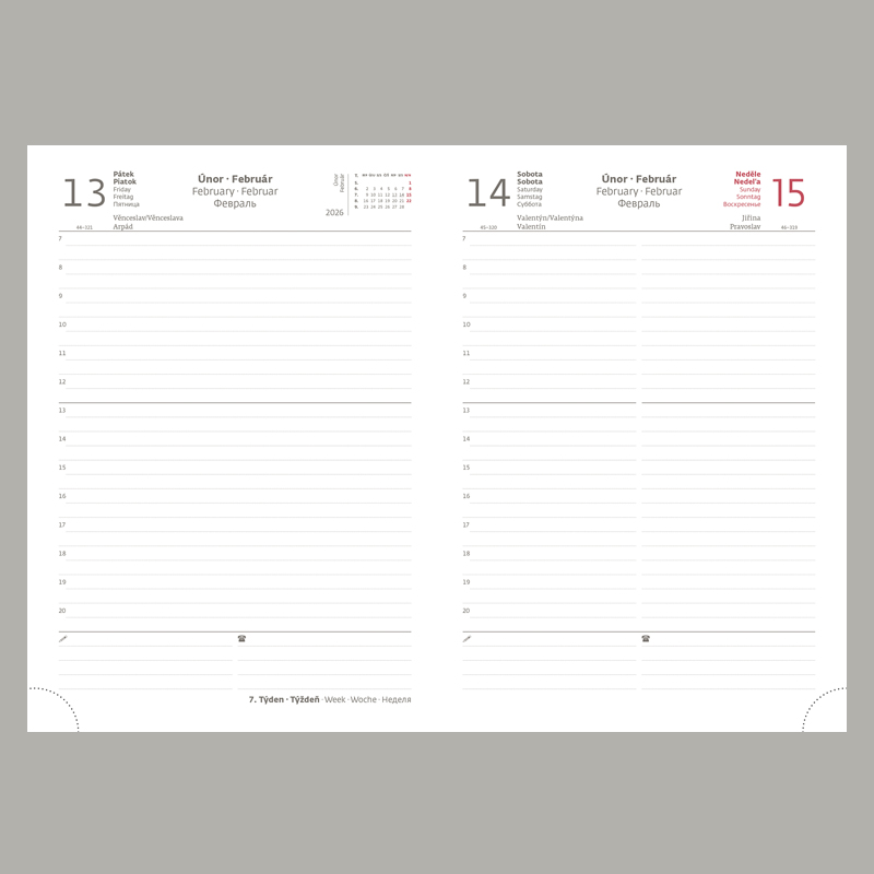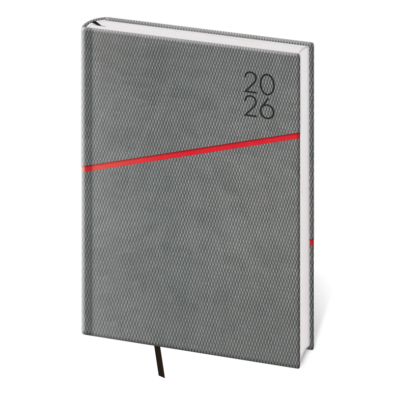 Dosky diára GRIFE sú vyrobené prevažne z šedej matnej a štruktúrovanej koženky. Šedá koženka je ozdobená farebným pruhom. Diár obsahuje: osobné údaje, plánovač dovolenky (mesačný prehľad), plánovací kalendár, medzinárodné sviatky, ročný výhľad, týždenný layout, adresár, mapa Európy a Českej a Slovenskej republiky. Rozmery: 145x205 mm. Počet strán: 352.