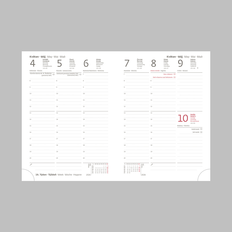 Obľúbené originálne dizajnové diáre vynikajú doskami, ktoré sú upravené špeciálnou lamináciou s hodvábnym efektom, vďaka ktorej sú veľmi príjemné na dotyk. Diár obsahuje: osobné údaje, plánovač dovolenky (mesačný prehľad), plánovací kalendár, telefónne predvoľby, štátne sviatky Českej a Slovenskej republiky, medzinárodné sviatky, ročný výhľad, týždenný layout, adresár, mapa Európy a Českej a Slovenskej republiky. Rozmery: 120x165 mm. Počet strán: 128.