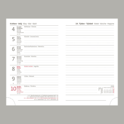 Dosky diára sú vyrobené z matného materiálu na báze zušľachteného papiera, ktorý je bez štruktúry a tým neruší vzhľad samotného produktu. Diár je doplnený gumičkou na uzavretie a pútkom na pero. Kompletný dizajn dopľňa obšitie dosiek niťou. Diár obsahuje: osobné údaje, plánovač dovolenky (mesačný prehľad), plánovací kalendár, medzinárodné sviatky, ročný výhľad, týždenný layout, adresár. Rozmery: 90x140 mm. Počet strán: 128.