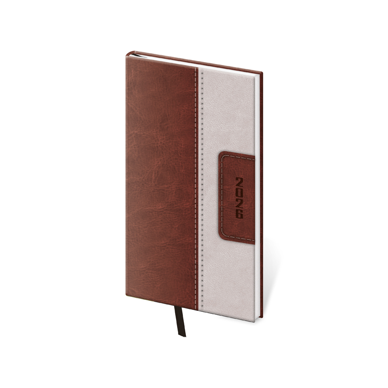 Materiál vďaka kvlitnej lesklej koženke pripomína svojím vzhľadom pravú kožu. Diár obsahuje: osobné údaje, plánovač dovolenky (mesačný prehľad), plánovací kalendár, medzinárodné sviatky, ročný výhľad, týždenný layout, adresár. Rozmery: 80x150 mm. Počet strán: 128.