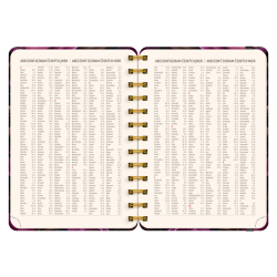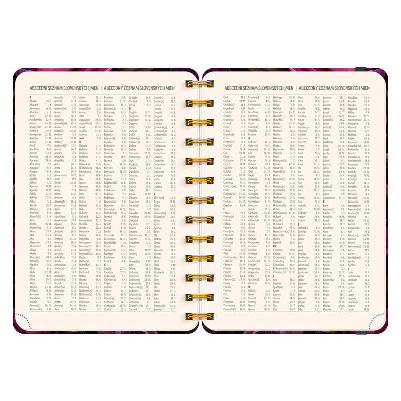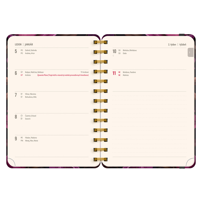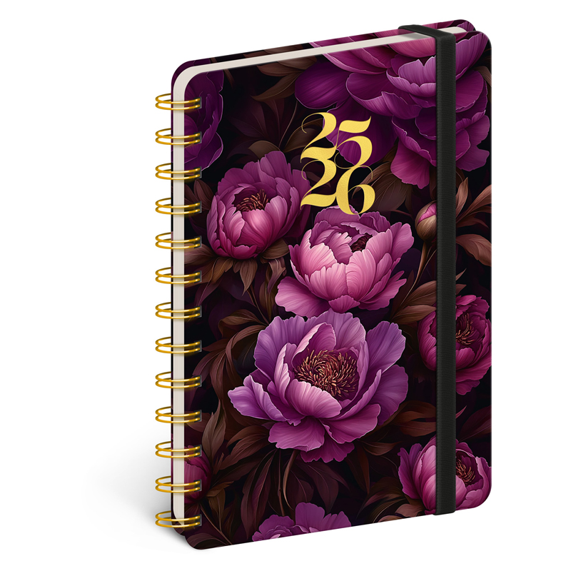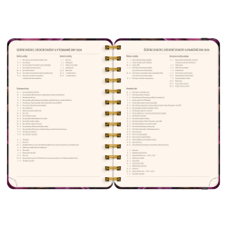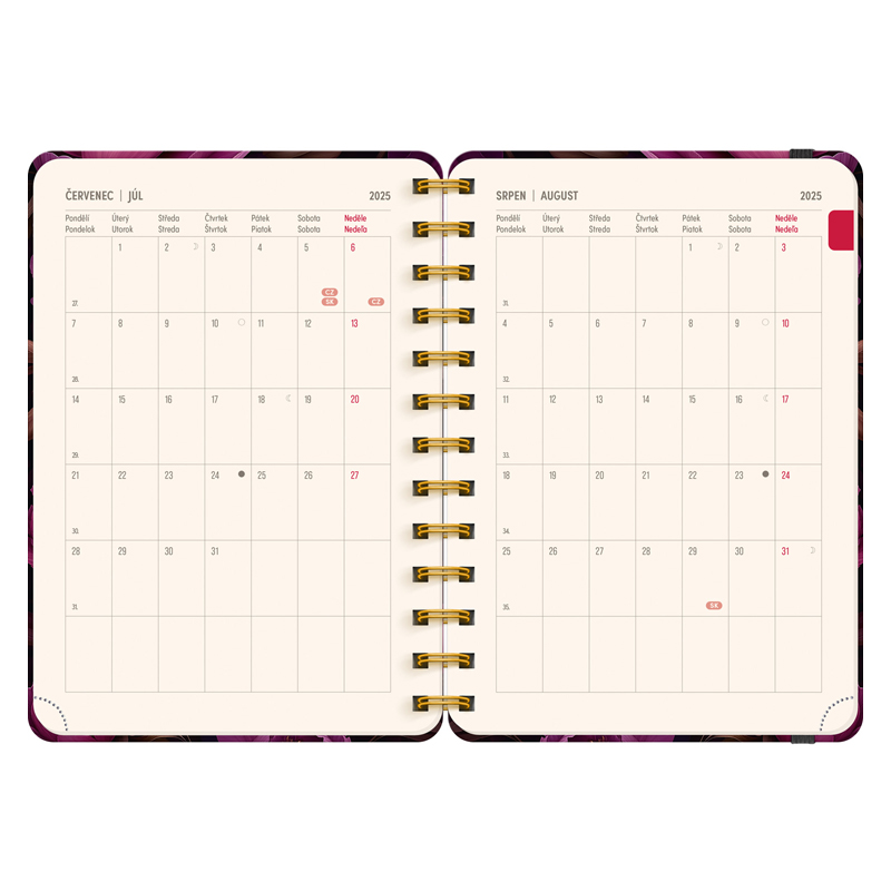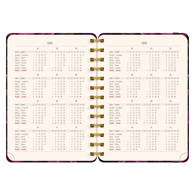 Osemnásťmesačný diár obsahuje prehľad na rok 2025 a 2026, zoznam českých a slovenských mien, česko-slovenské týždenné riadkové kalendárium s menami a sviatkami a priestor na poznámky. Kalendárium začína v júli 2025 a končí v decembri 2026. Gramáž: 80 g/m2 krémový papír Počet strán: 192 strán