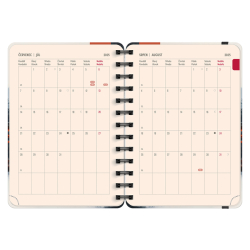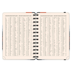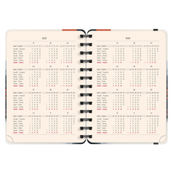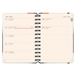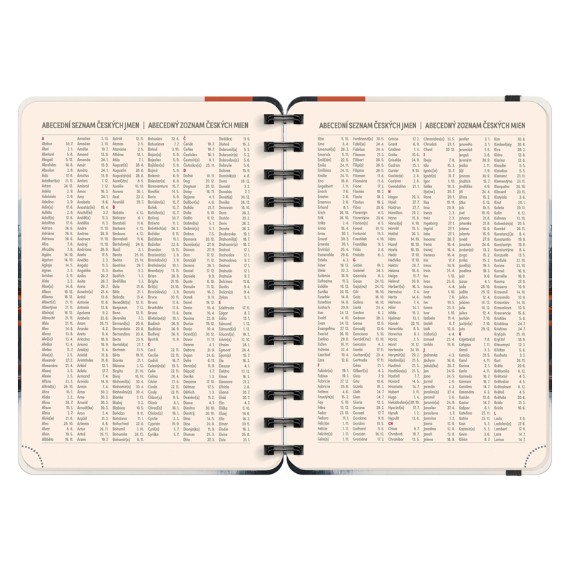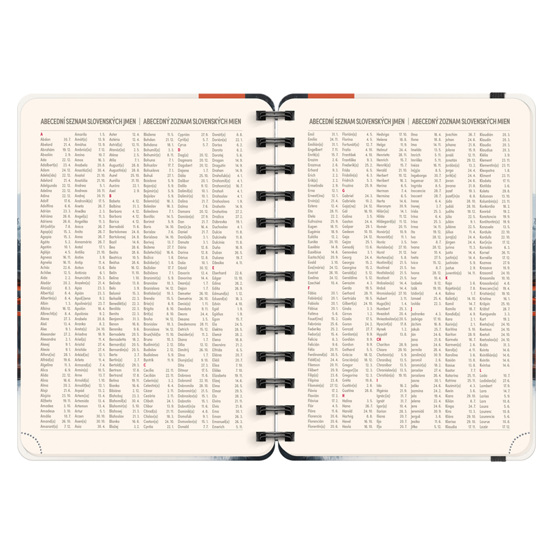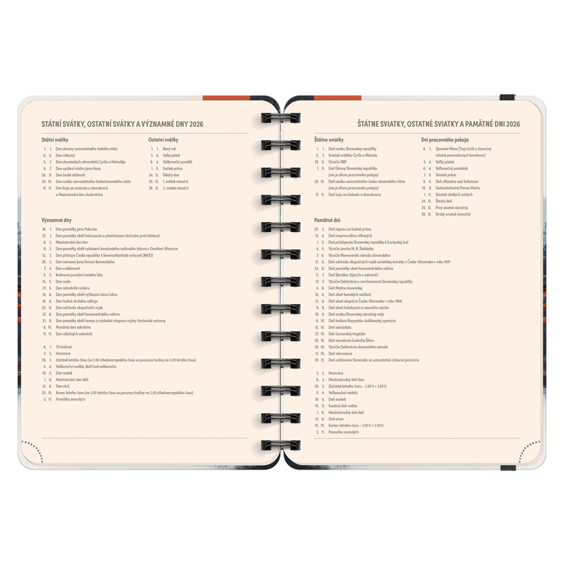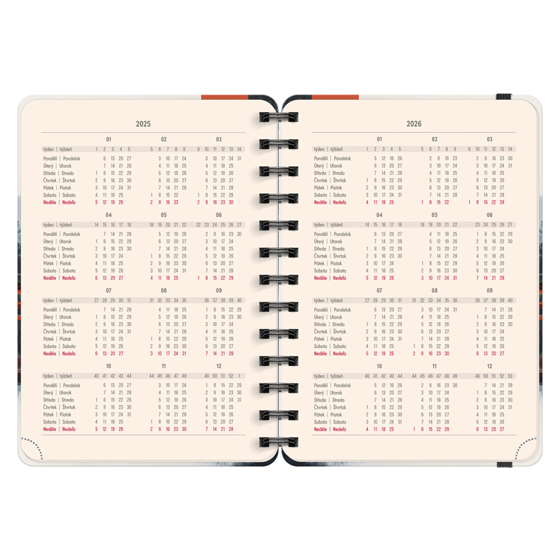 Osemnásťmesačný diár obsahuje prehľad na rok 2025 a 2026, zoznam českých a slovenských mien, česko-slovenské týždenné riadkové kalendárium s menami a sviatkami a priestor na poznámky. Kalendárium začína v júli 2025 a končí v decembri 2026. Gramáž: 80 g/m2 krémový papír Počet strán: 192 strán