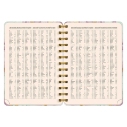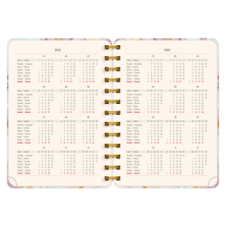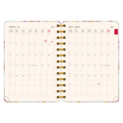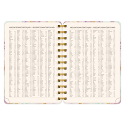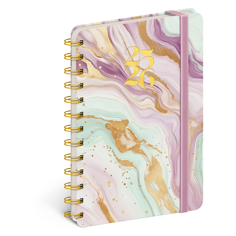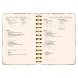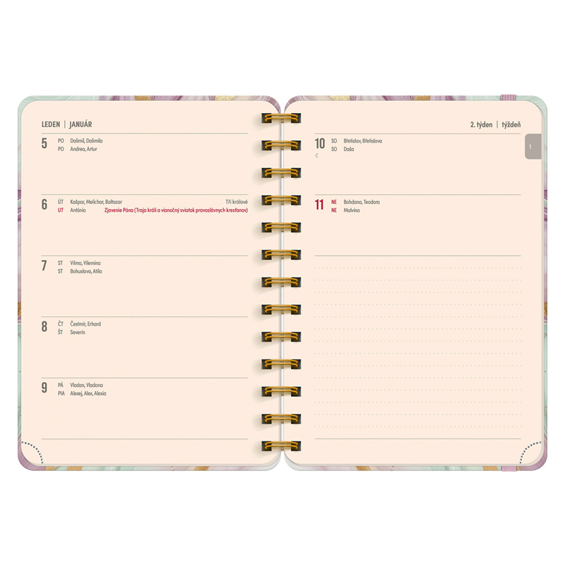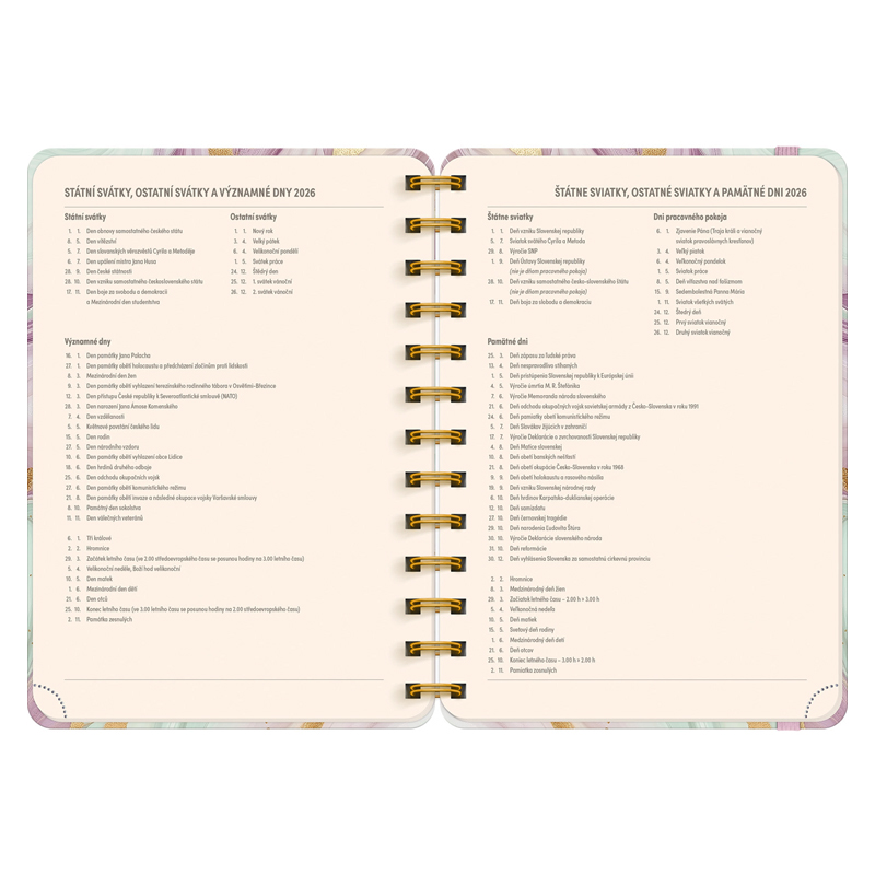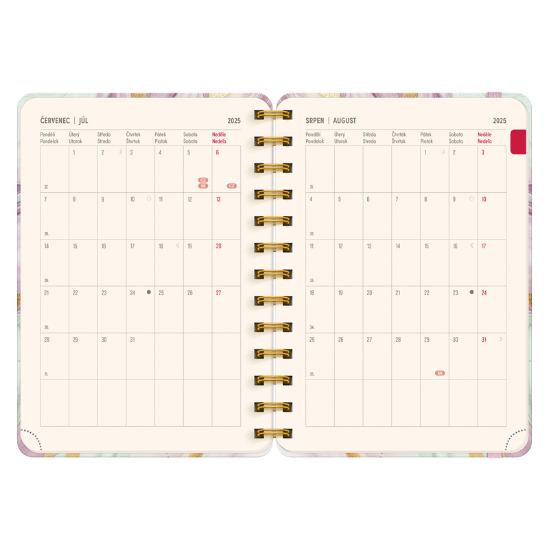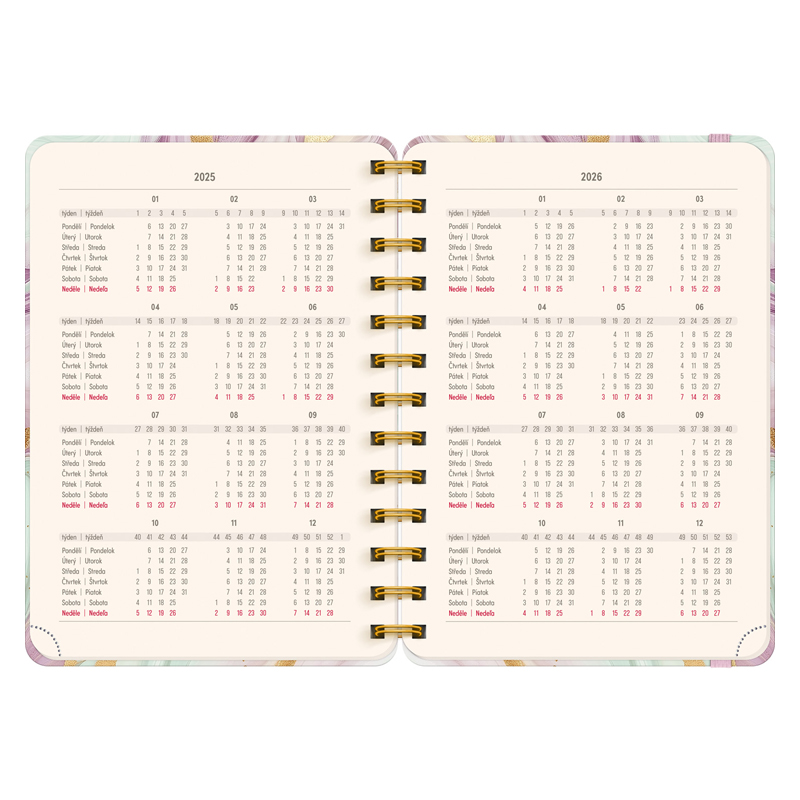Osemnásťmesačný diár obsahuje prehľad na rok 2025 a 2026, zoznam českých a slovenských mien, česko-slovenské týždenné riadkové kalendárium s menami a sviatkami a priestor na poznámky. Kalendárium začína v júli 2025 a končí v decembri 2026. Gramáž: 80 g/m2 krémový papír Počet strán: 192 strán