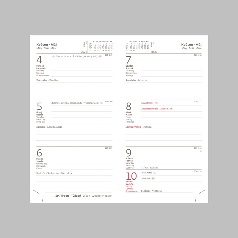 Matná koženka Vivella predstavuje kvalitný, na dotyk príjemný a zároveň veľmi obľubený materiál. Hrúbka materiálu umožňuje dosiahnuť perfektné výsledky pri razbe bez fólie. Diár obsahuje: osobné údaje, plánovač dovolenky (mesačný prehľad), plánovací kalendár, medzinárodné sviatky, ročný výhľad, týždenný layout, adresár. Rozmery: 80x150 mm. Počet strán: 128.