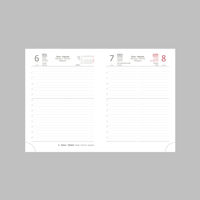 Matná koženka predstavuje kvalitný, na dotyk príjemný a zároveň veľmi obľúbený materiál. Hrúbka materiálu umožňuje dosiahnuť perfektné výsledky pri sleporazbe bez fólie. Diár obsahuje: osobné údaje, plánovač dovolenky (mesačný prehľad), plánovací kalendár, telefónne predvoľby, štátne sviatky Českej a Slovenskej republiky, medzinárodné sviatky, ročný výhľad, denný layout, adresár, mapa Európy a Českej a Slovenskej republiky. Rozmery: 120x165 mm. Počet strán: 336.