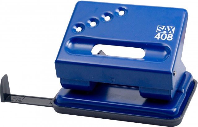 Kvalitný, výkonný dierovač SAX 408 s ľahkým celokovovým telom, vybavený posuvným príložníkom. Dierkuje až 30 listov naraz! Bude skvelým pomocníkom na doma, do kancelárie. Rozpätie dier 80mm, priemer otvoru 5,5mm. Je vhodný na dierovanie dokumentov a papierov pre ukladanie do krúžkových aj pákových poradačov a do karisblokov alebo rýchloviazačov. Plastové dno, zabraňuje poškodeniu podložky (nábytku) ako aj znečisteniu okolia. - farba: modrá - kapacita dierovania: 30 listov. Farba: modrá.