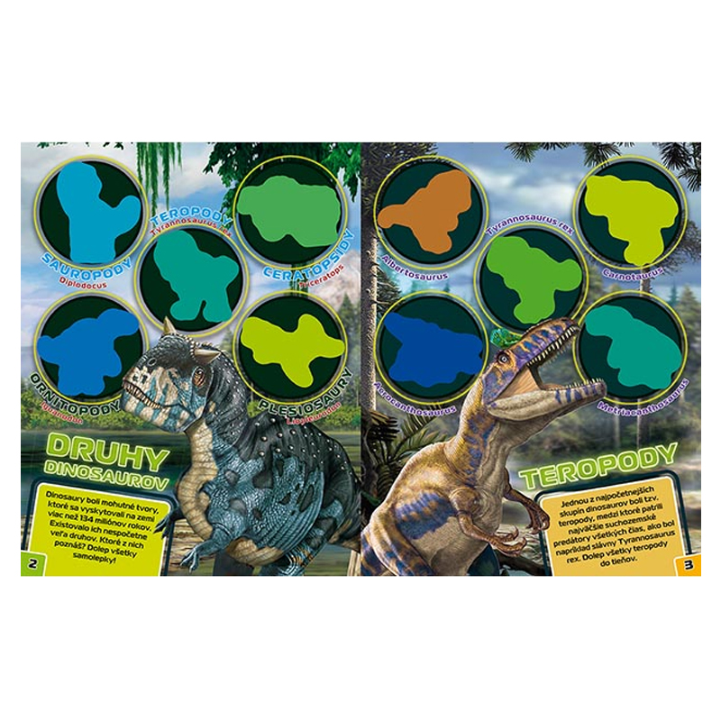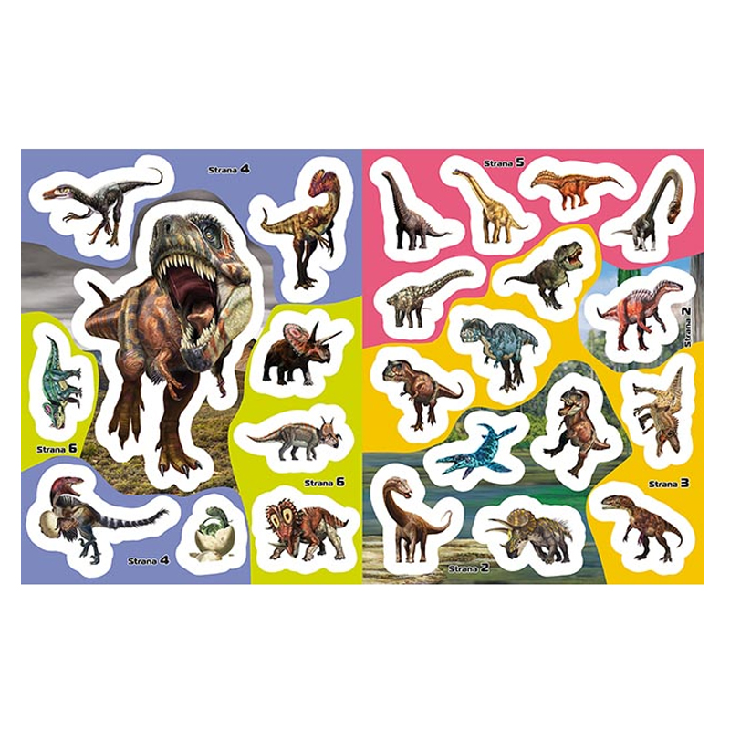 Samolepková knižka obsahuje 12 strán a 4 strany samolepiek na dolepenie. Vybrané samolepky majú okraje, ktoré v tme svietia. Motív: Dinosaury. Rozmer: 276 X 216 X 3 mm