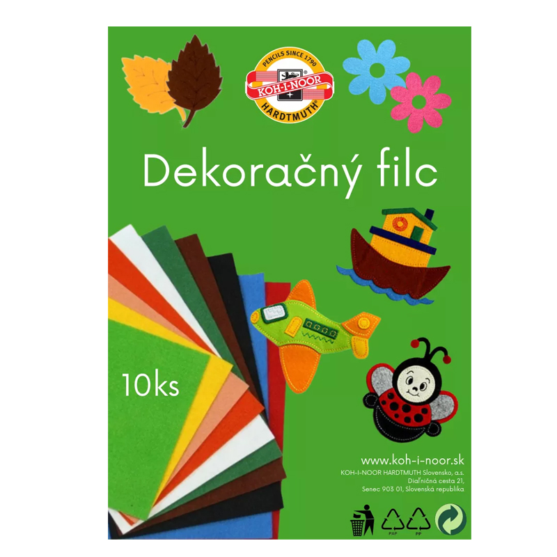 Farebný dekoračný filc. Hrúbka: 200g/m2. Rozmer: 300x200mm. 10 rôznych farieb v balení.