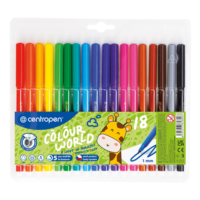 Farebné popisovače Centropen ERGO držanie zdraviu neškodlivý atrament vyprateľné ventilačný vrchnák valcový hrot odolný voči zatlačeniu šírka stopy 1 mm počet farieb: 18, karton: 24 ks