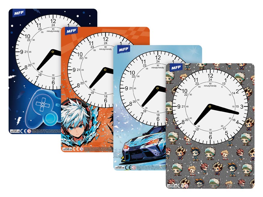 Detské papierové hodiny v mixe chlapčenských motívov. Didaktická pomôcka, dobre využiteľná na výučbu času u detí predškolského veku alebo u prváčikov. Tieto cvičné hodiny nesmú chýbať Vášmu dieťaťu pri nástupe do prvej triedy základnej školy.Motí
