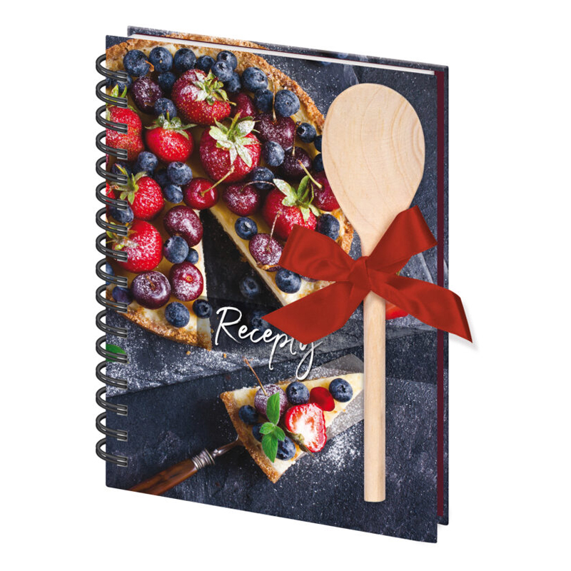 Kniha na recepty s vareškou, stránky sú linajkované, bez popiskov. Každých osem listov je rozdelených papierovým rozdeľovníkom, ktorý je možné popísať druhom receptu. Kniha obsahuje celkom desať rozdeľovníkov. Kniha s bočnou dvojitou špirálou a veľmi kvalitnými pevnými doskami je perfektná ako darček pre všetkých, čo radi varia a chcúsi uchovať svoje najlepšie recepty. Na úvodných doskách je mašľou pripevnená vareška na varenie. Namiesto nej potom môžete dať napríklad ceruzku na písanie receptov. Materiál: papier, drevená vareška. Rozmery: 14,5 x 1,2 x 20,5 cm.