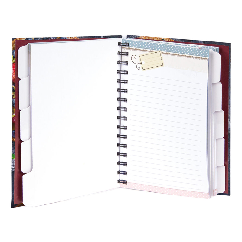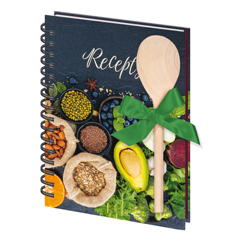 Kniha na recepty s vareškou, stránky sú linajkované, bez popiskov. Každých osem listov je rozdelených papierovým rozdeľovníkom, ktorý je možné popísať druhom receptu. Kniha obsahuje celkom desať rozdeľovníkov. Kniha s bočnou dvojitou špirálou a veľmi kvalitnými pevnými doskami je perfektná ako darček pre všetkých, čo radi varia a chcúsi uchovať svoje najlepšie recepty. Na úvodných doskách je mašľou pripevnená vareška na varenie. Namiesto nej potom môžete dať napríklad ceruzku na písanie receptov. Materiál: papier, drevená vareška. Rozmery: 14,5 x 1,2 x 20,5 cm.