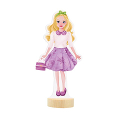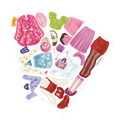 Balenie obsahuje obliekaciu bábiku, 3 hárky magnetických častí (oblečenie, topánky, doplnky) a drevený podstavec