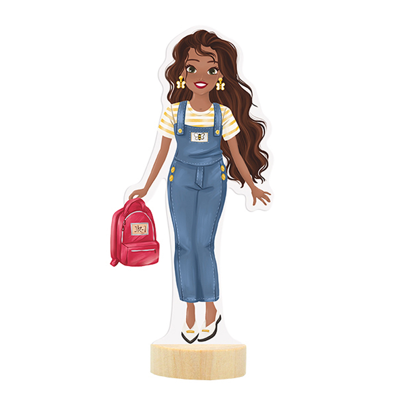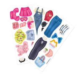 Balenie obsahuje obliekaciu bábiku, 3 hárky magnetických častí (oblečenie, topánky, doplnky) a drevený podstavec