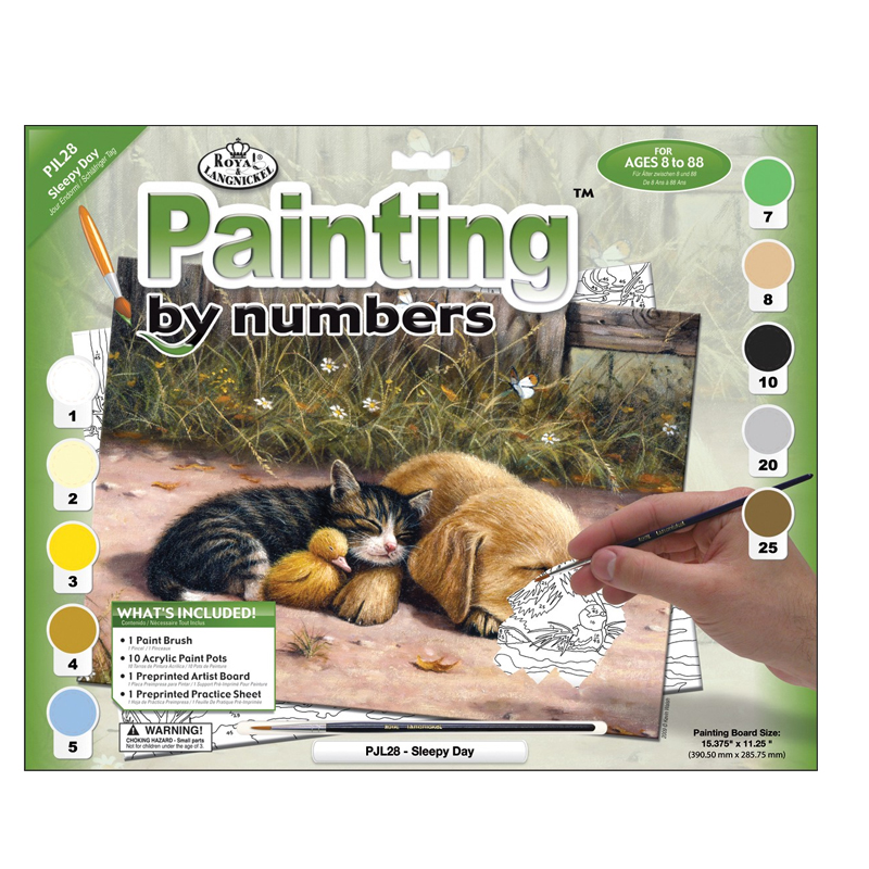 Sada obsahuje: - 1 ks okrúhleho štetca - 10 ks akrylových farieb v kalíškoch - 1 ks predtlačenej predlohy s číslami - 1 ks vyhotovená farebná predloha Veľkosť obrázka: 40,00 x 32,4 cm.