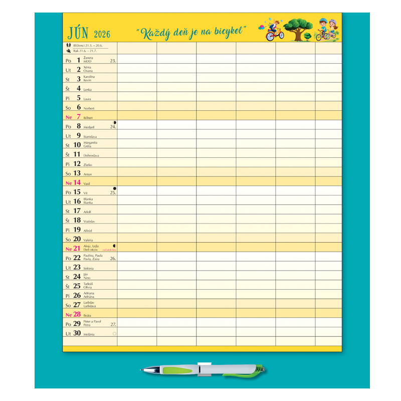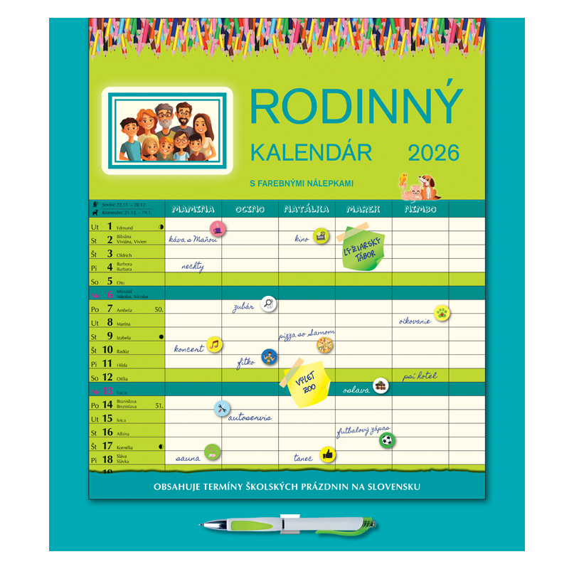 Formát kalendára: 28 x 34 cm. Formát dosky: 33 x 37 cm. Počet listov kalendára: 14. Kalendár obsahuje farebné emotikony a piktogramy - Vyjadrite pomocou nálepiek svoju činnosť, pocity či emócie + Praktické pero