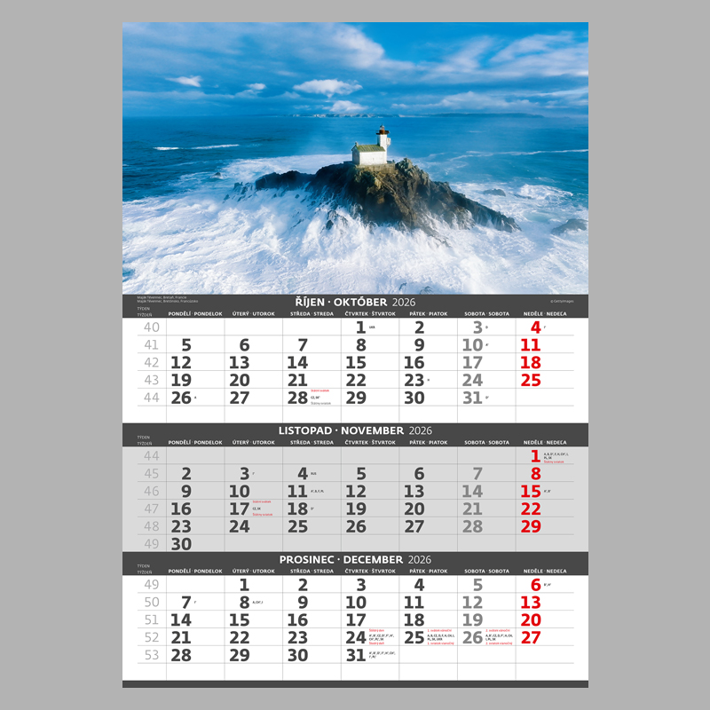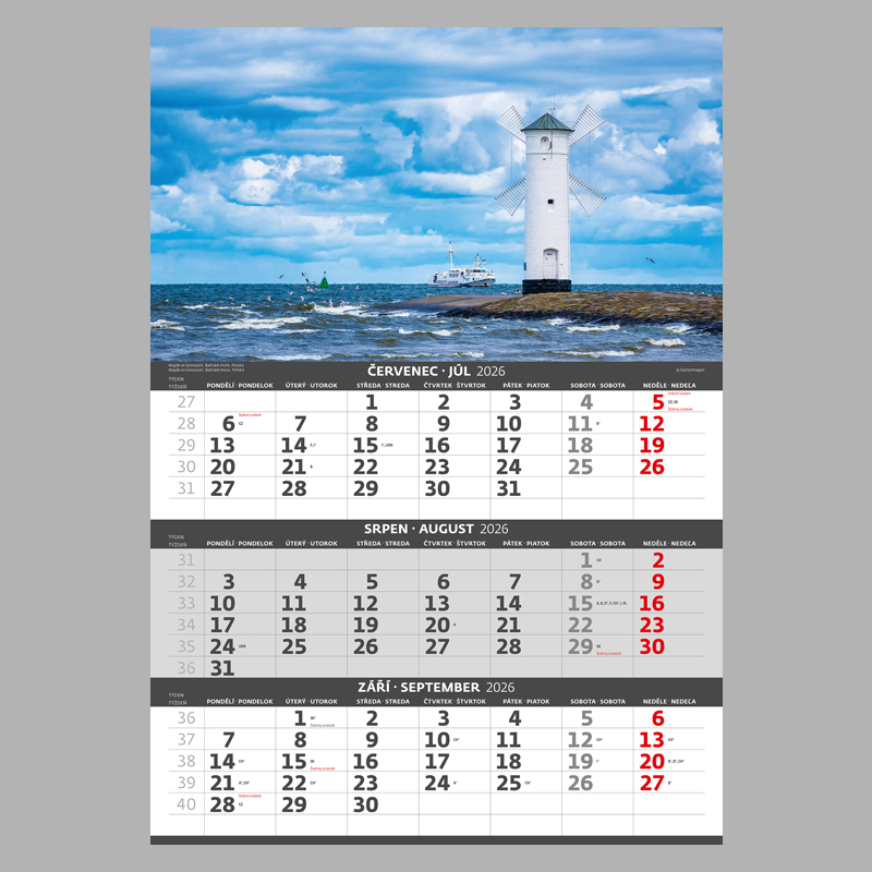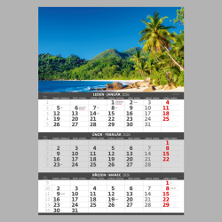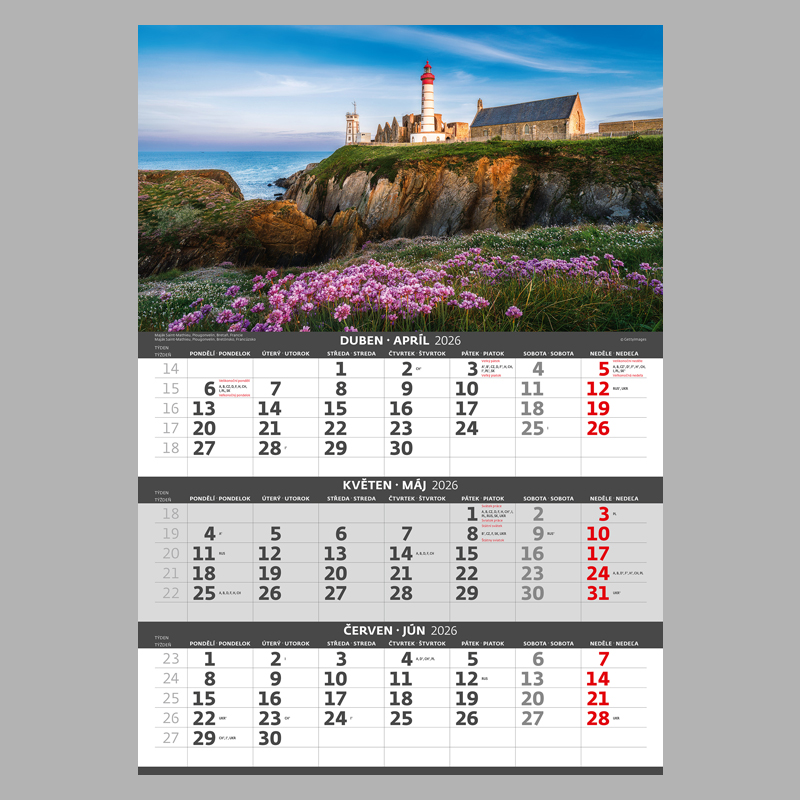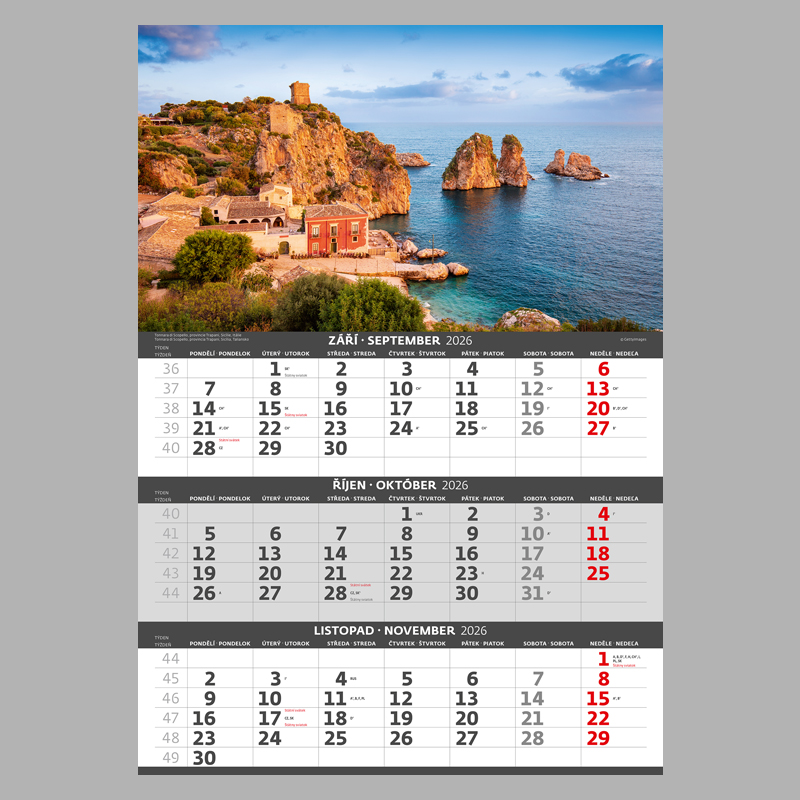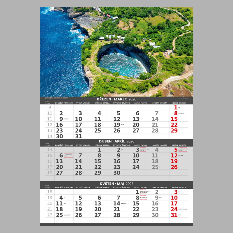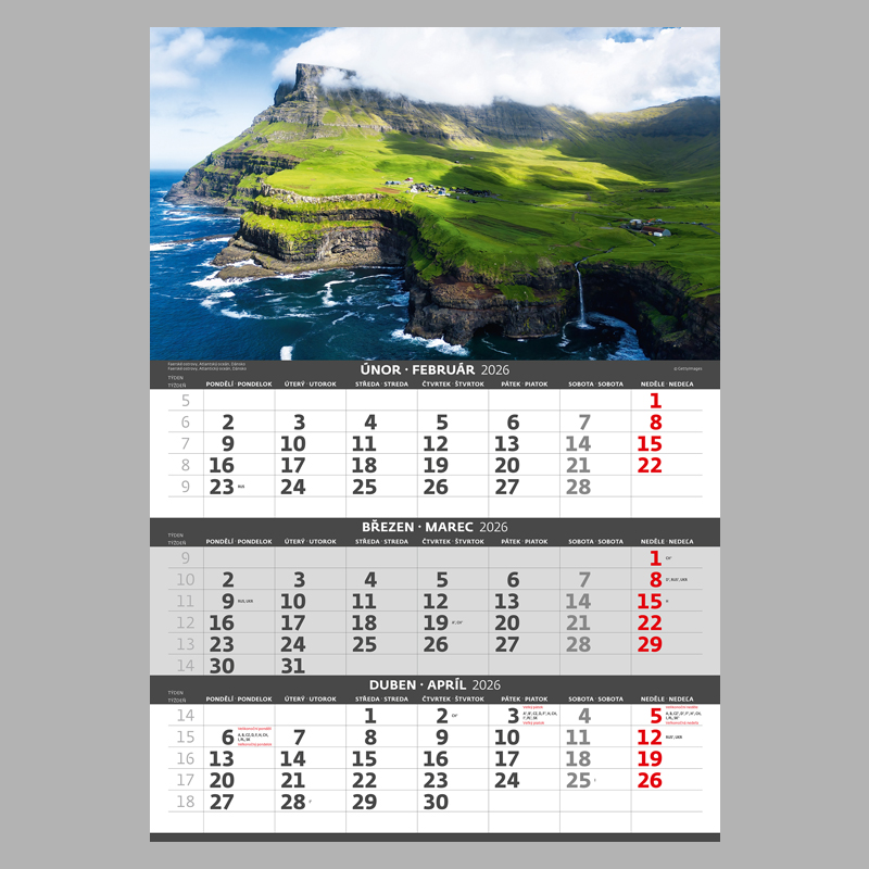 Formát kalendára: 31,5 x 45 cm • Kalendárium: české/slovenské trojmesačné so sviatkami európskych štátov (CZ / SK / A / B / D / F / H / CH / I / PL / RUS / UKR) • Rozsah kalendára: 12 listov • Priestor na potlač: 31,5 x 7 cm