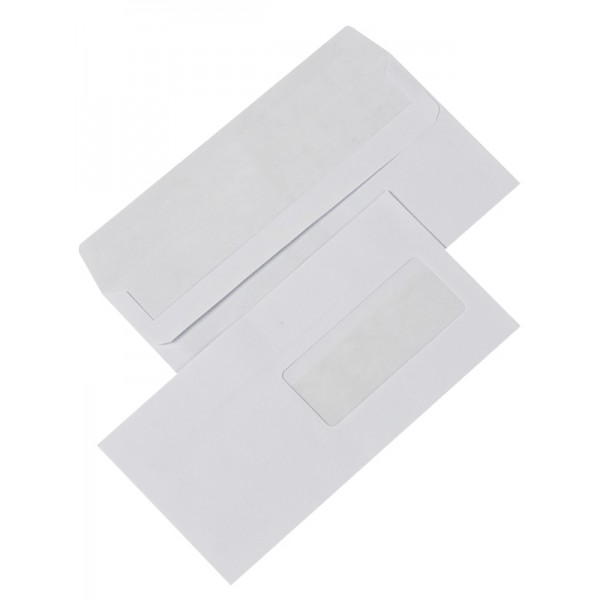 Biele okienkové samolepiace podlhovasté obálky, na zasielanie bežnej listovej korešpondencie, vyrobené z bieleho ofsetu s gramážou 80 g/m2