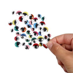 Mix farebných krútiacich sa očí s plochou zadnou časťou vybavenou samolepkou. Zreničky sa hýbu. Mix rôznych velkostí 8-12 mm. Spolu 30 kusov.