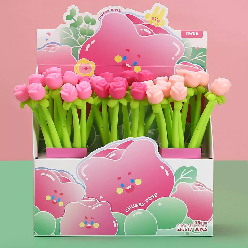 Gélové pero s gumenou kvetinkou na vrchnom, ohybnom konci (3 farby). Modrý atrament, stopa (hrot) 0,5 mm, dĺžka tuhy 13cm. Silikónové telo s nasadzovacím viečkom. Balenie: 36ks. Dodávané ako mix farieb bez možnosti výberu konkrétneho motívu.