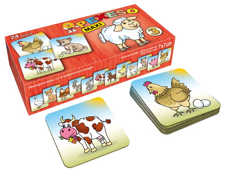 Hra Pexeso LUX obsahuje 12 motívov hracích kariet po 2ks. Veľkosť kartičiek: 7x7cm. Karty sú vyrobené z tvrdej lepenky cca 2,5mm a majú zaguľatené rohy, čo ich robí optimálnym pre malé deti.