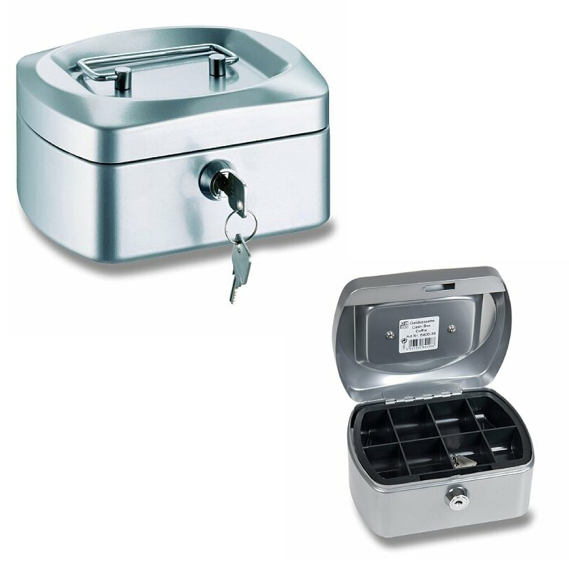 Príručná pokladnička RON, rozmery 155 x 120 x 80 mm. Farba : strieborná.