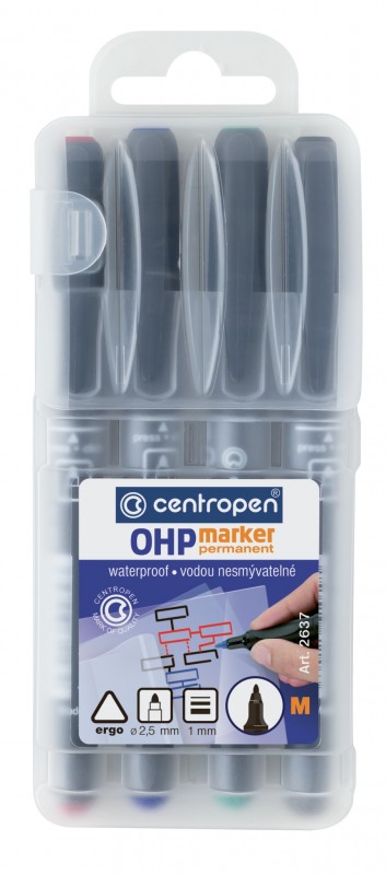 Špeciálne značkovače na projektor (OHP) 2637 M s permanentným atramentom odolným voči vode a stieraniu, umývateľný liehom. Vláknitý hrot, šírka stopy 1,0 mm. Balenie 4 farieb.