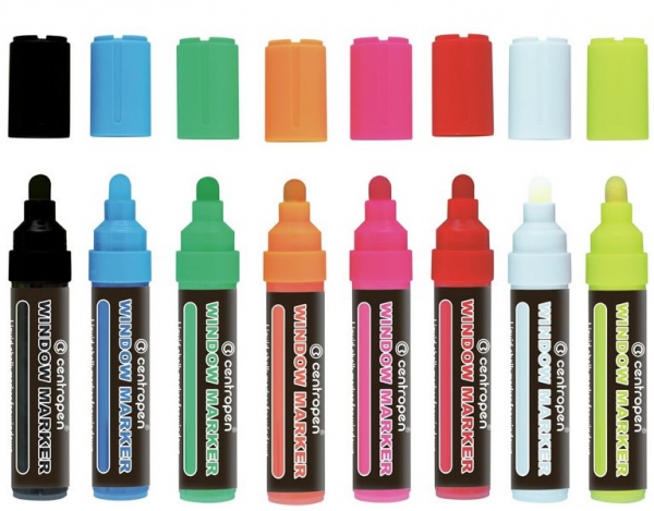 Špeciálny značkovač na neporézne povrchy (okná, zrkadlá, výklady,...), tekutá krieda na vodnej báze. Stierateľný s valcovým hrotom a stopou 3-4mm.
