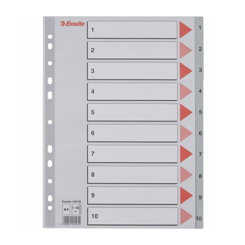 Registre pre číselné roztriedenie dokumentov v zoraďovačoch či doskách do formátu A4 s popisovateľnou titulnou stranou. Spevnená multiperforácia plastovým prúžkom na titulnej strane. 10 deliacich listov so štítkami 1-10 pre rýchlu orientáciu v obsahu