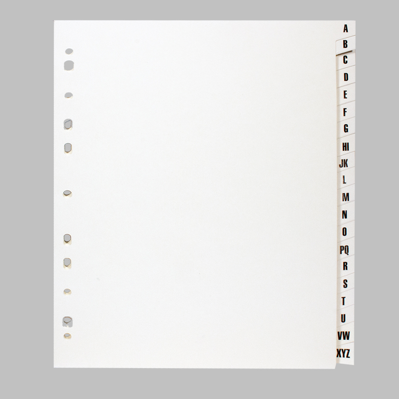 Kartónové rozraďovače formátov A4 . Umožňujú  abecedné triedenie. Univerzálne dierovanie, predtlačený popisovateľný titulný list. Formát A4 umožňuje využitie rozraďovača pri ukladaní dokumentov v prospektových obaloch.