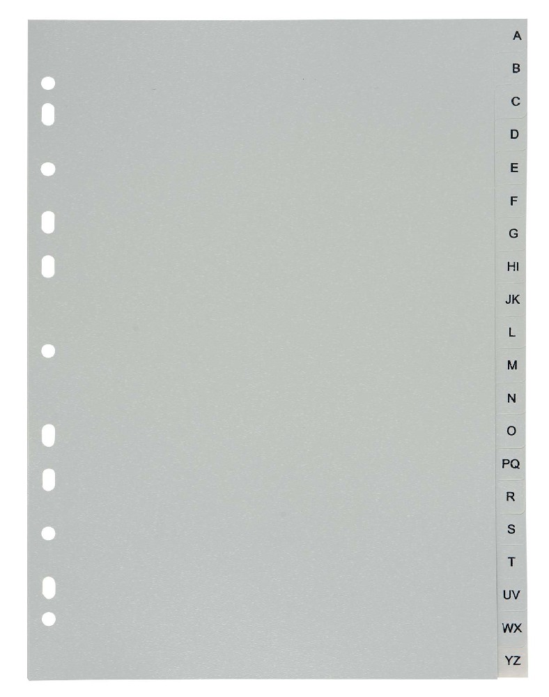 Plastové rozraďovače formátov A4 . Umožňujú abecedné triedenie. Univerzálne dierovanie, predtlačený popisovateľný titulný list. Formát A4 umožňuje využitie rozraďovača pri ukladaní dokumentov v prospektových obaloch.