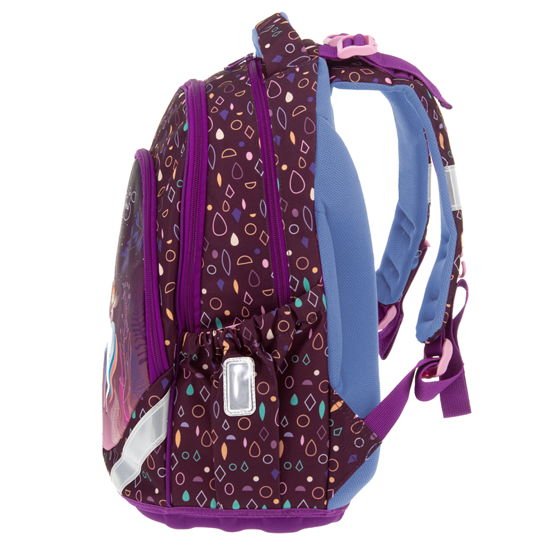 Zadná strana batohu obsahuje mäkkú penu pre pohodlné nosenie. Polstrované ramenné popruhy sú ľahko nastaviteľné, takže sú pohodlné na chrbát predškolákov. Navyše je batoh dodávaný s hrudným popruhom , ktorého dĺžku je možné nastaviť. Hrudné popruhy sú v tomto veku dôležité, pretože zabraňujú skĺznutiu batohu z detských ramien. Väčšia priehradka poskytuje dostatok priestoru pre plyšové hračky, malú deku alebo oblečenie. Predná priehradka je ideálna na uloženie boxu na desiatu. Táto priehradka sa dá rozšíriť asi o 6 cm. Do bočných vreciek sa zmestí fľaša na vodu (do 0,7 l) a dáždnik. Zipsy sa veľmi ľahko otvárajú a zatvárajú aj malými detskými rukami a prstami. Reflexné prvky umiestnené vpredu a vzadu zvyšujú viditeľnosť. Má dostatočne dlhú rukoväť, aby ho aj rodičia mohli pohodlne nosiť.. Materiál: vodeodolný polyester. Rozmer: 23x20x15cm.