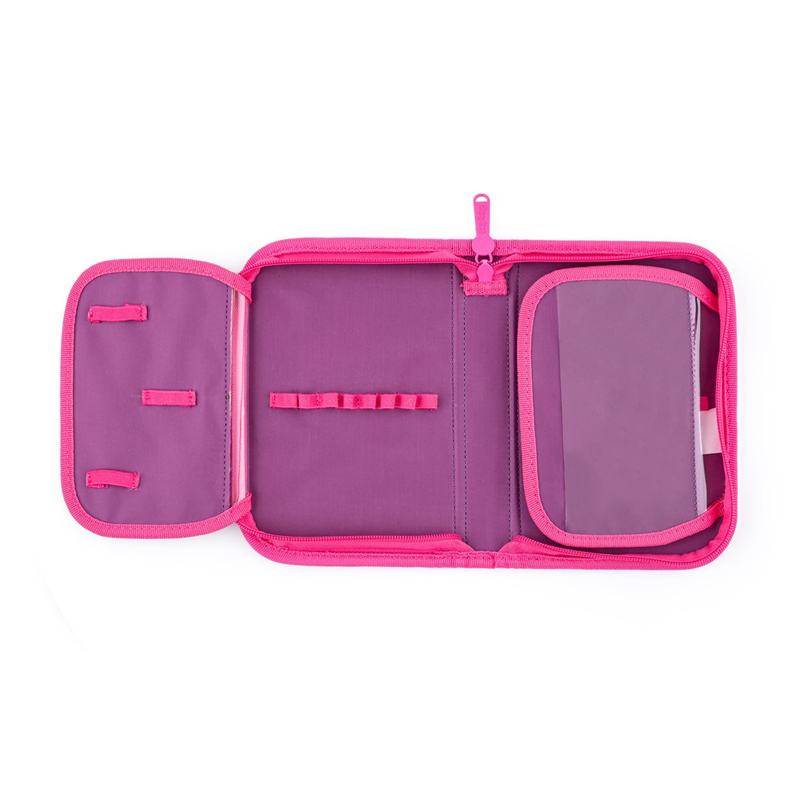 Detský školský jednoposchodový peračník s dvomi klopami, s 25 gumovými úchytmi na ceruzky a perá, gumu a prepážkou s priehľadnou fóliou a rozvrhom hodín. V peračníku je pravítko 15cm + guma + struhatko.