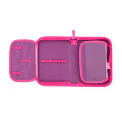 Prázdny jednoduchý peračník s jednou klopou,s gumovými úchytmi na ceruzky a perá, vreckom na suchý zips vhodným na peniaze, gumu a prepážkou s priehľadnou fóliou a rozvrhom hodín.