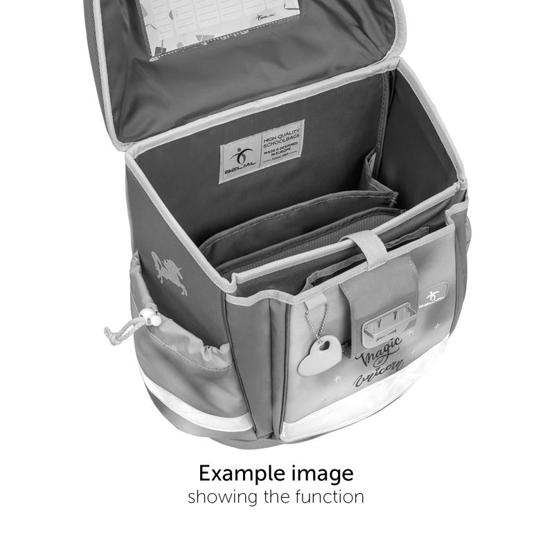 Každú tašku Belmil doplňuje pogumovaná rukoväť pre lepšie držanie a masívna reflexná pracka na zapínanie pre nikdy nevykotenú školskú náplň, pričom vo vnútri nájdu deti izolovaná časť s priestorom pre kartičku s menom a adresou alebo na rozvrh hodín. Na boku sú 2 bočné vrecká pre fľaše s nápojmi. Pre deti je pohyblivý rozdeľovač vo vnútri tašky pre lepšie rozloženie obsahu.