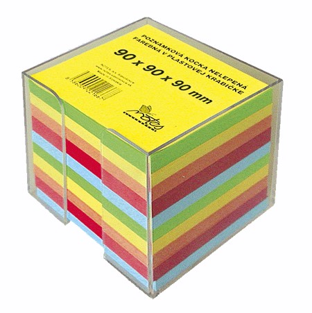 Papieriky na poznámky, odkazy, ... Formát kocky 90 x 90 x 90 mm, dúhová nelepená, v plastovom stojane.