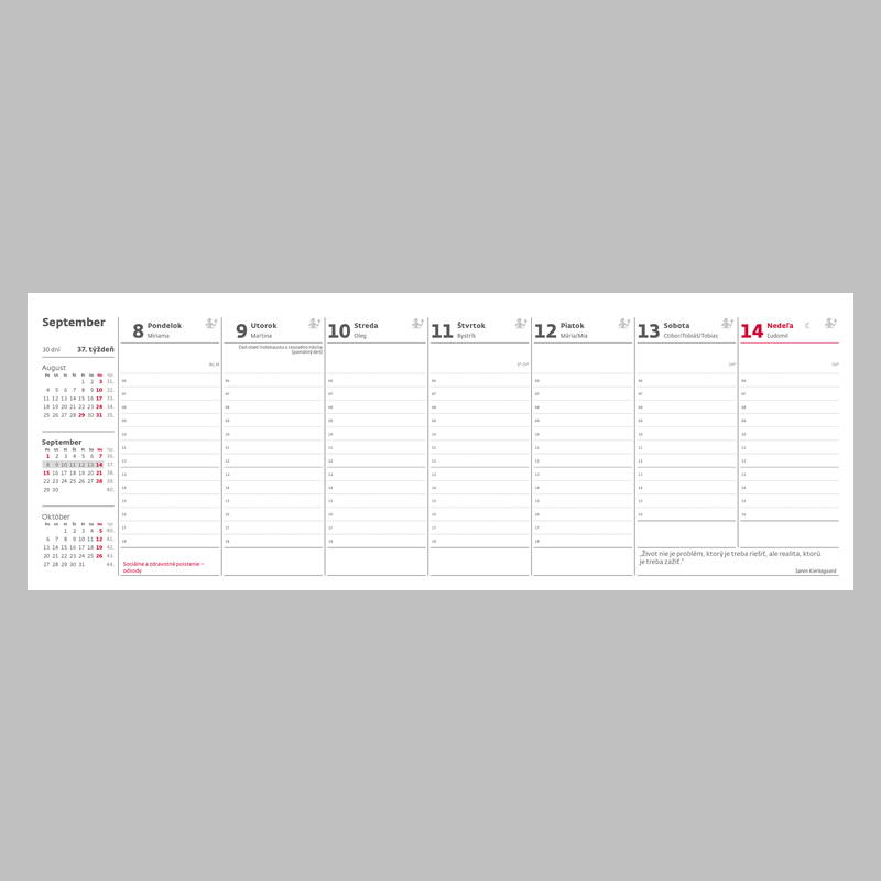 Formát kalendára: 33,6 x 12,1 cm • Kalendárium: slovenské týždenné stľpcové • Počet strán kalendára: 64 + 2 • Stojanček: so zámkom • Priestor na potlač: 33,6 x 3,5 cm • + dane a ročné obdobia, znamenia zverokruhu, citáty, sviatky v EÚ, 3mesačný prehľad